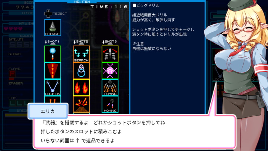70種以上の装備がランダムに供給されるローグライト+縦スクロールSTG。