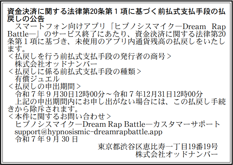 オッドナンバーは、『ヒプノシスマイク-Dream Rap Battle-』のサービスを2025年9月30日12時をもって終了することを発表した。