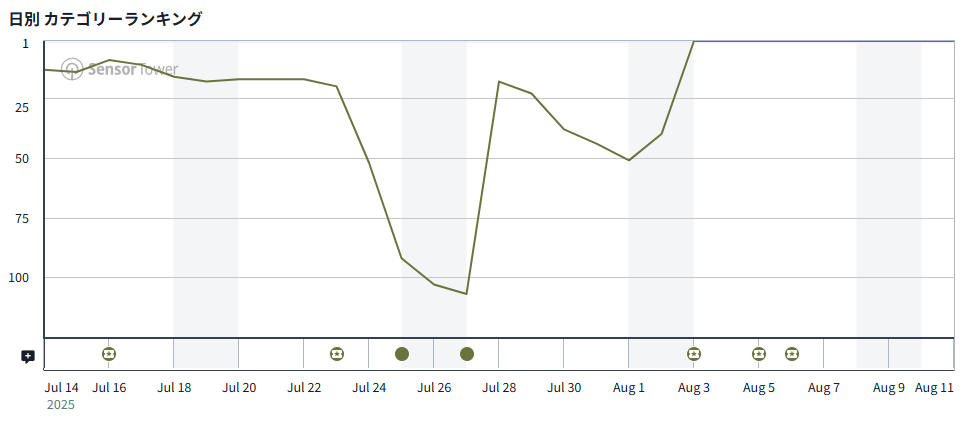 同じく周年イベントを開催中のWFS『ヘブンバーンズレッド』が103ランクアップの14位と大きく順位を上げた。3.5周年のイベント・キャンペーンの一環として、SS<レゾナンス>[CODE:Virtual Killer]朝倉可憐がピックアップ対象となっている3.5th Anniversary ユニゾンステップアップガチャの開催とともに、当該ガチャが利用できる3.5th Anniversary ユニゾン プレミアムパックを販売している。