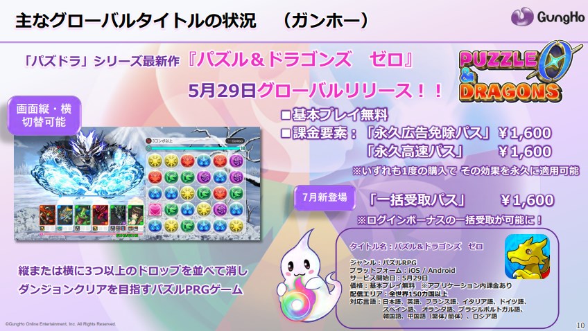 なお、5月29日には「パズドラ」シリーズ最新作『パズル&ドラゴンズ ゼロ』をグローバルリリースしているが、こちらはガチャがなく、広告収益もしくは広告免除パスなどの販売という、収益モデルとなっており、急速な業績寄与という形にはなりにくいタイトルということになりそうだ。