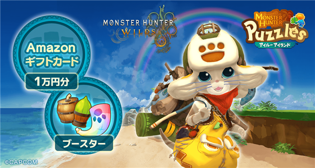「モンスターハンターワイルズコラボ」公式X (@MHPuzzles)をフォローし、 キャンペーン期間中に指定されたポストをリポストした方から抽選で10名に1万円分のAmazonギフトカード(デジタルギフト)をプレゼントする。さらに、キャンペーン期間中に対象ポストのリポスト数が1万を突破した場合、ゲームをプレイしている方全員にブースターをプレゼント。