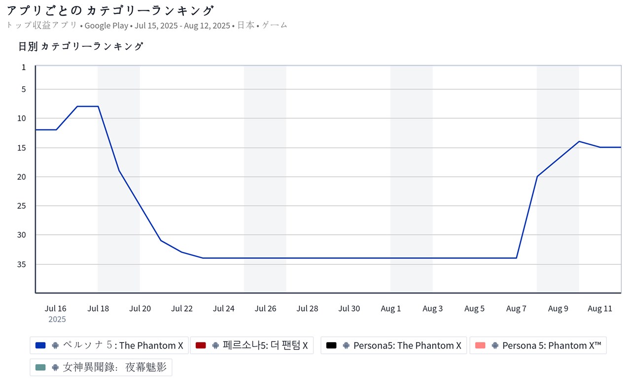 前日に15位まで順位を上げていたのがセガの『ペルソナ5: The Phantom X』だ。『P5X』は、8月5日より『ペルソナ5』とのオリジナルイベント第2弾・後半を開始するとともに、新たな★5怪盗として『ペルソナ5』の「新島 真」(コードネーム:クイーン)が登場していることが足元の売上に貢献しているものと思われる。