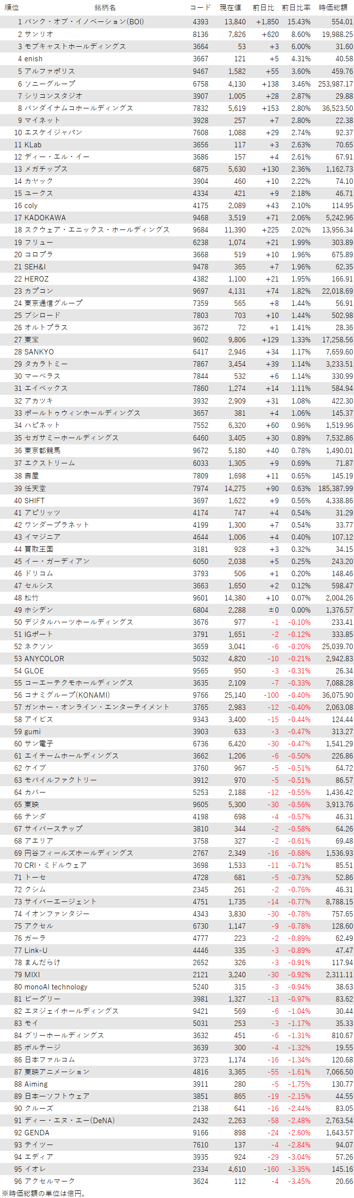 そうした中でゲーム・エンタメ関連株の動きを見てみると、下記の表に登録しているゲーム・エンタメ関連企業96銘柄のうち、上昇は48銘柄(50%)、下落は47銘柄(49%)、変わらずは1銘柄(1%)で、上昇と下落がほぼ拮抗する結果となった。