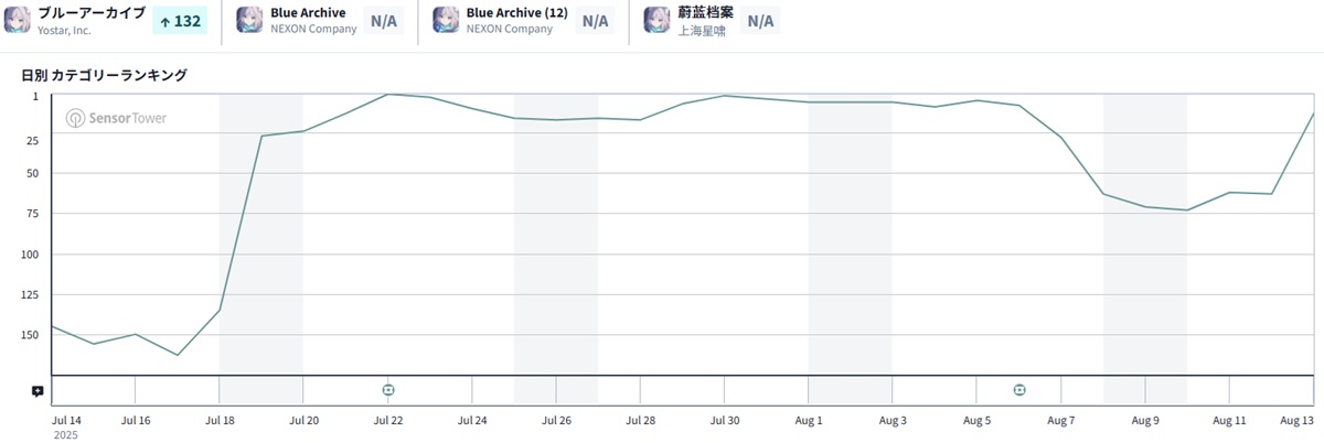 『ブルアカ』は8 月 13 日より、★3「トキ」、★3「ナギサ」、★3「カンナ」、★3「チアキ」がそれぞれ登場する復刻ピックアップ募集を開催しており、売上につながったもよう。