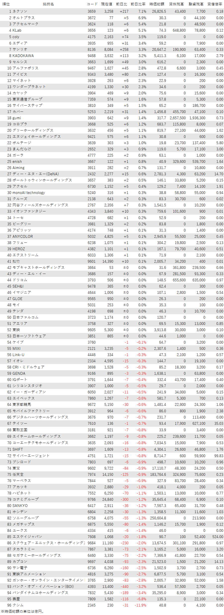 モバイルゲーム系の銘柄は、DeNA<2432>、グリーHD<3632>、コロプラ<3668>が高く、サイバーエージェント<4751>、MIXI<2121>、ガンホー<3765>、アカツキ<3932>、ケイブ<3760>、モバイルファクトリー<3912>が安い。