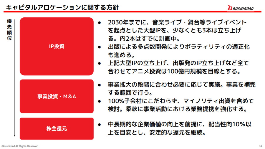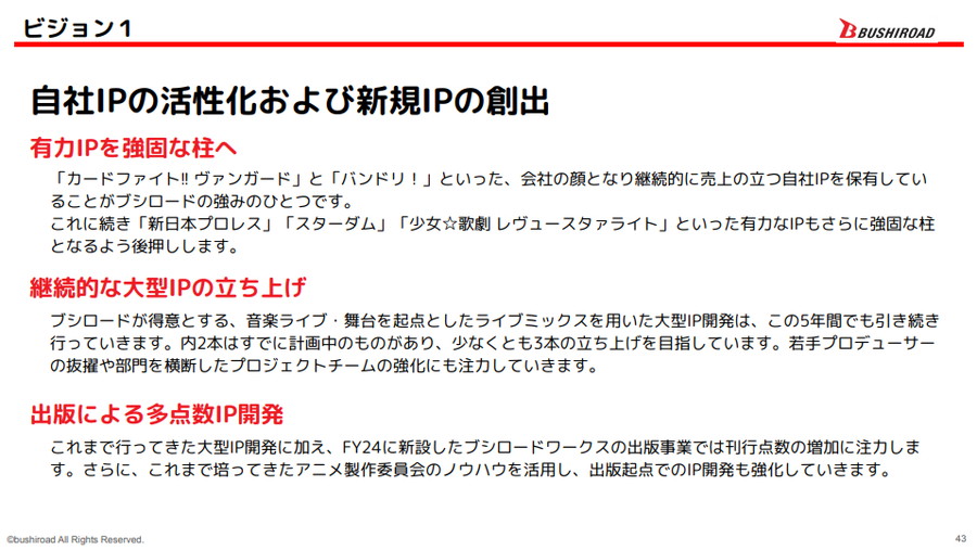 IP開発については、「カードファイト!!ヴァンガード」や「バンドリ!」を中心とする主力IPの育成に引き続き注力するとともに、同社の得意とする音楽ライブと舞台を起点として育てていく手法で最低3本の大型IPの立ち上げを図る。さらに、ブシロードワークスの出版事業を起点とするIP開発とアニメ投資も行っていく。