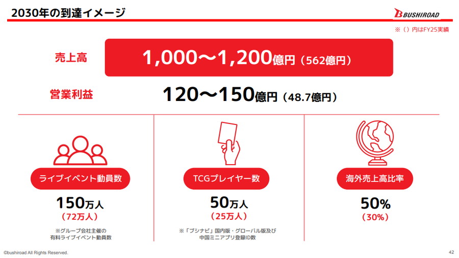 ブシロード<7803>は、この日(8月14日)、「中期ビジョン2025-2030」を公開し、2030年に売上高1000億円~1200億円(25年6月期比で78.0%増~113.6%増)、営業利益120億円~150億円(同146.5%増~208.1%増)を目指す。IP開発とカードゲームの成長、海外進出の加速などを通じて成長を狙っていく考えだ。