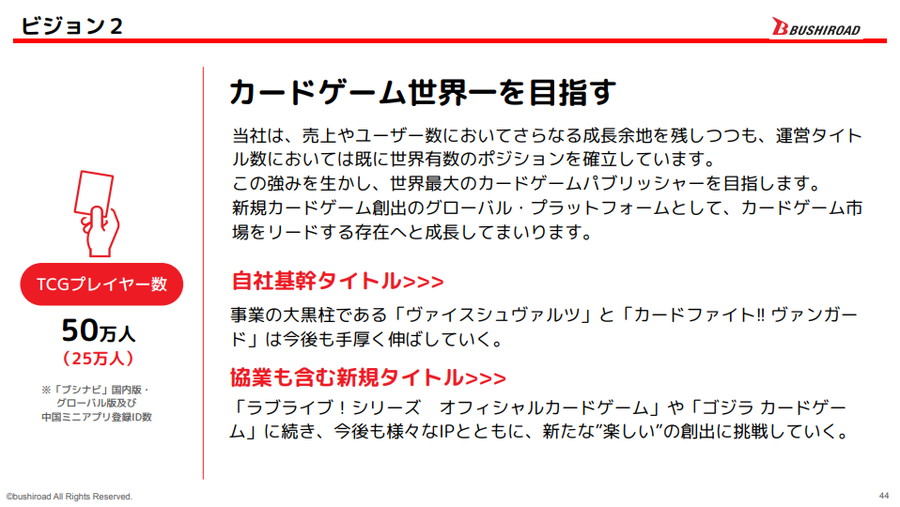 カードゲームについては、「カードファイト!!ヴァンガード」と「ヴァイスシュヴァルツ」を中心に主要タイトルを伸ばす一方で、「ラブライブ!オフィシャルカードゲーム」や「ゴジラカードゲーム」のような様々な人気IPと組んだタイトルも創出し、世界最大のカードゲームパブリッシャーの座を狙う。
