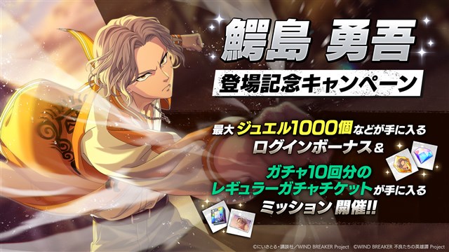 [獅子頭連のNo.3]鰐島 勇吾の登場を記念して、キャンペーンを開催する。最大ジュエル1,000個などが手に入るログインボーナスや、ガチャ10回分のレギュラーガチャチケットが手に入るミッションを開催する。ぜひゲームをプレイしてアイテムを手に入れよう!