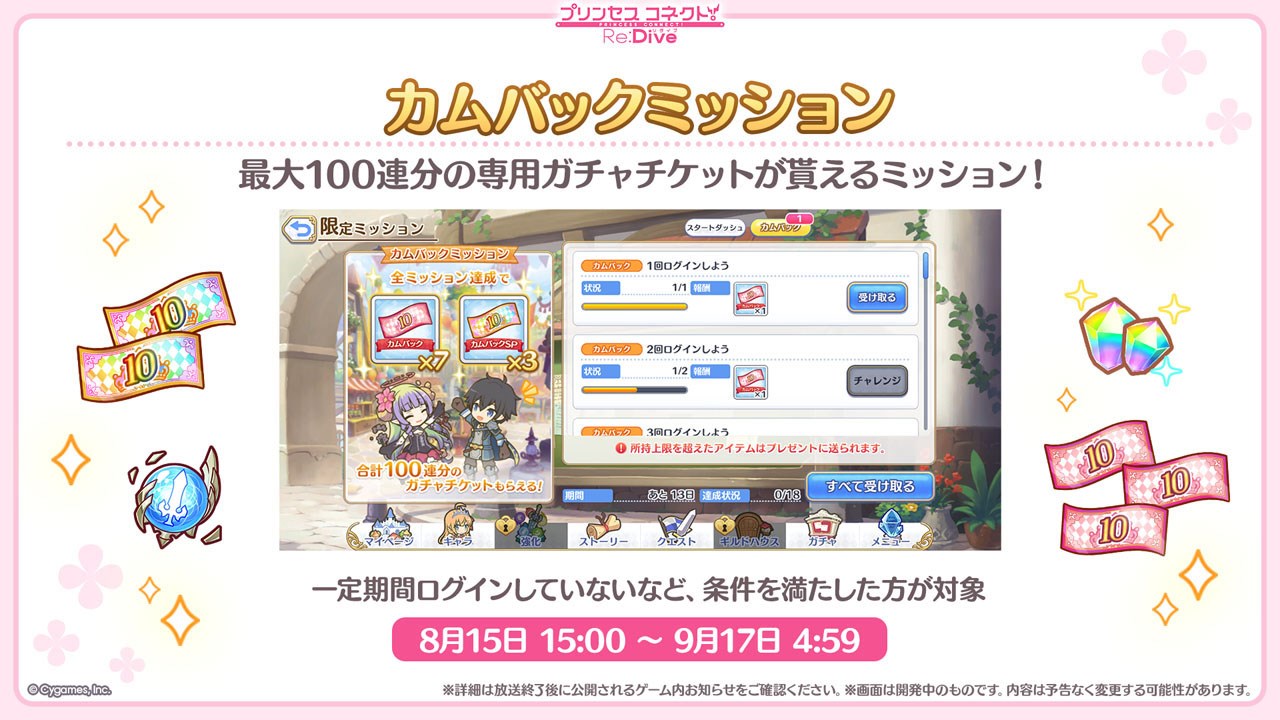 本日から「カムバックミッション」を開催する。こちらは90日以上『プリコネR』にログインしていない方を対象に開催されるミッションで、全て達成ると、「カムバック10連ガチャチケット」7枚、「カムバックスペシャル10連ガチャチケット」3枚を獲得することができる。キャンペーンの対象者を含む詳細は公式サイトのお知らせで確認できる。