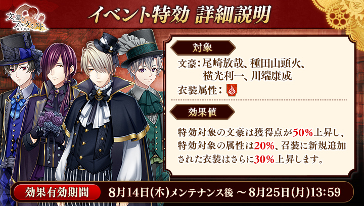 さらに、イベントと同時に開催される限定召装『以心伝心相通ず』にて新規追加された「尾崎放哉」「種田山頭火」「横光利一」の〈ゴシック風衣装〉を編成すると、得点の獲得率がそれぞれ30%上昇。