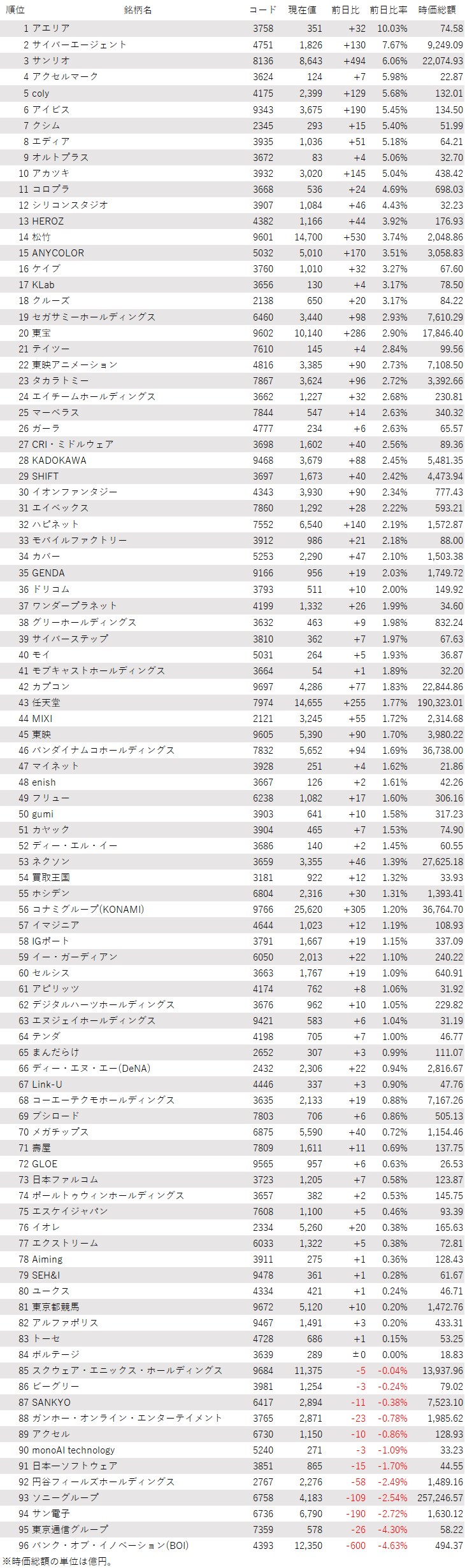 そうした中でゲーム・エンタメ関連株の動きを見てみると、下記の表に登録しているゲーム・エンタメ関連企業96銘柄のうち、上昇は83銘柄(86%)、下落は12銘柄(13%)、変わらずは1銘柄(1%)で、上昇した銘柄が多数を占めた。