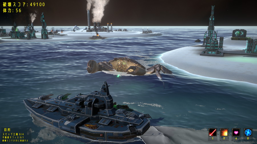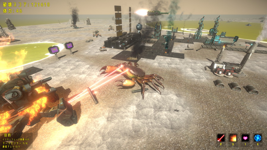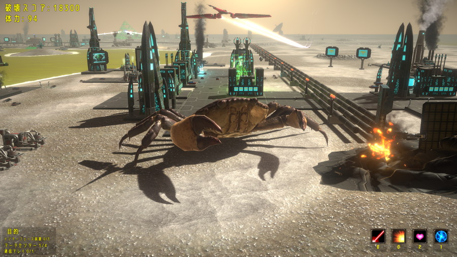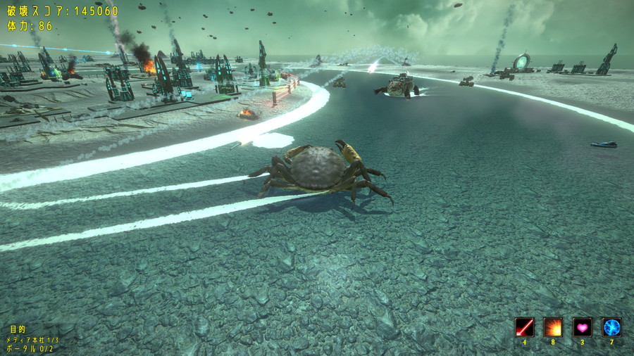 小さな物体は踏み潰し、大きな施設や中ボスはハサミで攻撃しよう。破壊スコアを稼ぐとスキルの使用回数が補充され、強力な攻撃、移動、回復のスキルが使える。破壊スコアを目標値まで稼ぎ、ターゲットに指定した施設をすべて破壊するとステージクリアだ。