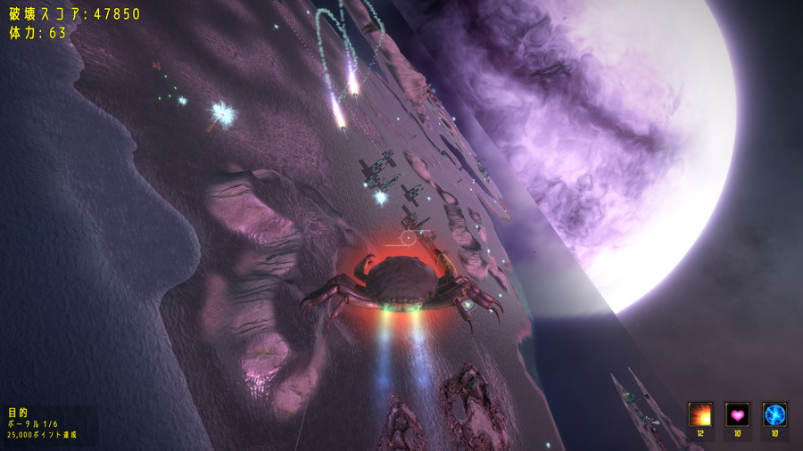 次の惑星へと向かう宇宙ステージでは、戦闘機のように巨大ガニが飛び回り、360度全方位の射撃戦となる。ターゲットの敵艦を狙い撃ち、木っ端微塵に粉砕せよ。