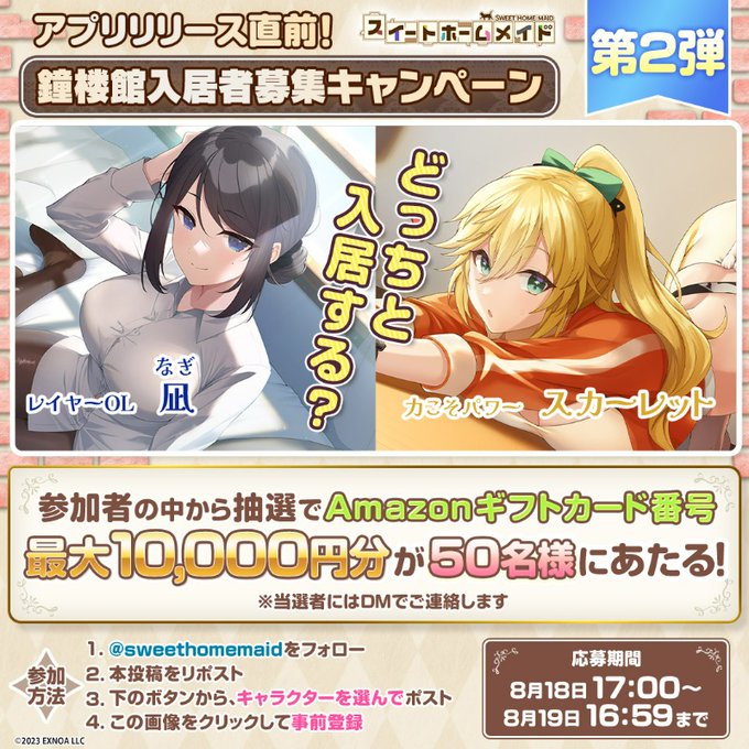 EXNOA、アプリ版「スイートホームメイド」が事前登録者数7万人達成…リリース日が8月21日(木)に決定、Amazonギフトカード番号が当たるXキャンペンも開催