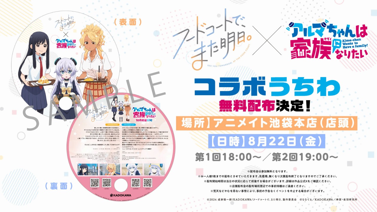 KADOKAWA<9468>は、7月より放送中のTVアニメ「フードコートで、また明日。」と、10月より放送予定のTVアニメ「アルマちゃんは家族になりたい」原作が共に「コミックNewtype」で連載中の作品同士によるコラボを発表した。