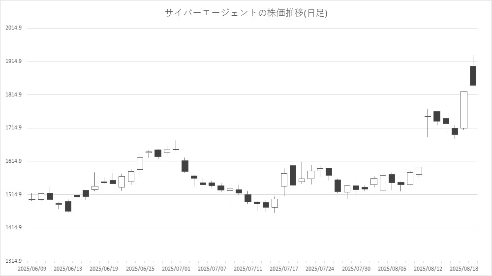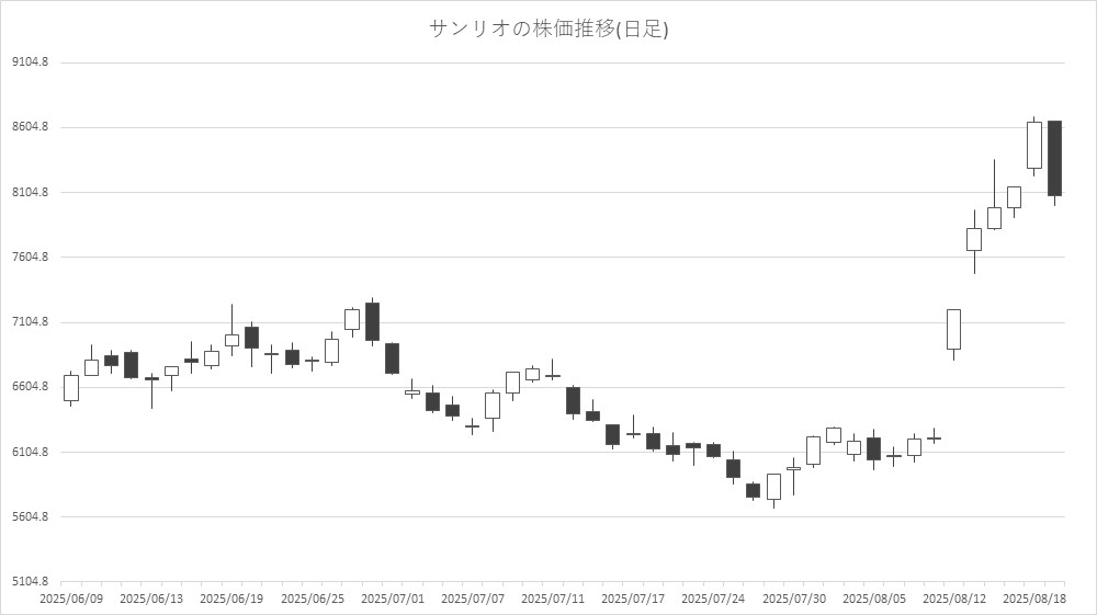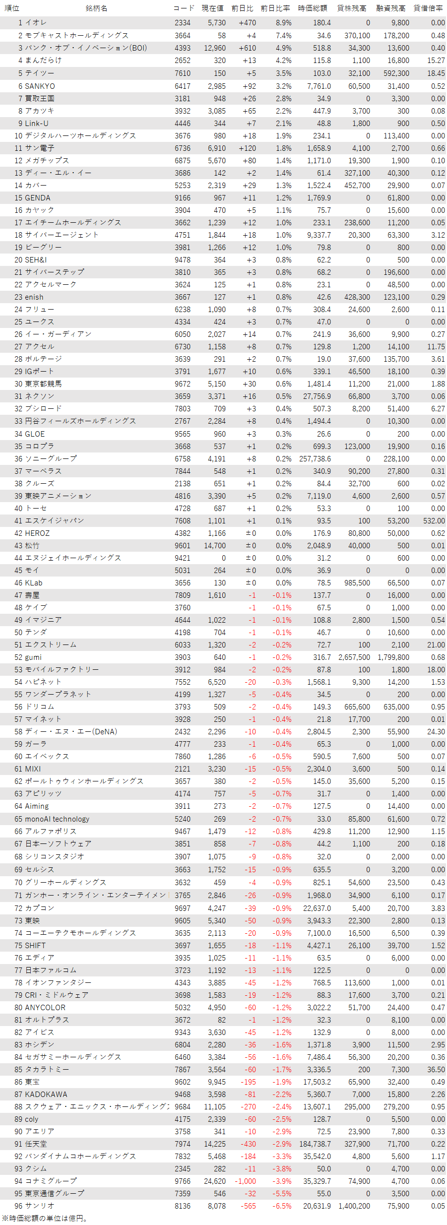 最後に騰落ランキングを見ると、イオレ<2334>やモブキャストHD<3664>、バンク・オブ・イノベーション(BOI)<4393>、まんだらけ<2652>が値上がり率上位となり、サンリオ<8136>、東京通信G<7359>、コナミG<9766>、クシム<2345>が値下がり率上位となった。