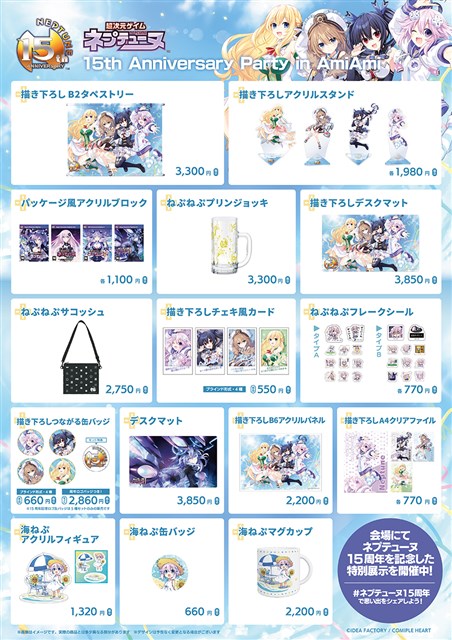 「ネプテューヌ」シリーズの発売15周年を記念しPOP UP SHOPが開催中。その名も「超次元ゲイム ネプテューヌ 15th Anniversary Party in AmiAmi」!描き下ろしの15周年記念イラストを使用したグッズを多数ご用意したイベントとなっている。特別な展示企画も盛りだくさんなので、会場へぜひお立ち寄りください!