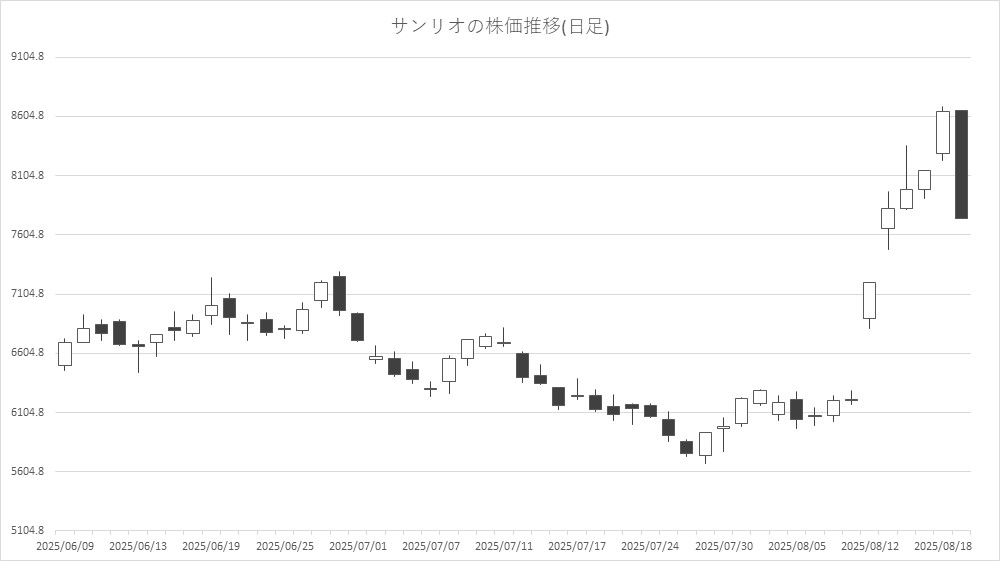 IGポート<3791>、GENDA<9166>、東映アニメ<4816>、フリュー<6238>、ブシロード<7803>が高く、タカラトミー<7867>、サンリオ<8136>、東宝<9602>、KADOKAWA<9468>、エディア<3935>が安い。特にサンリオの下げがきつい。