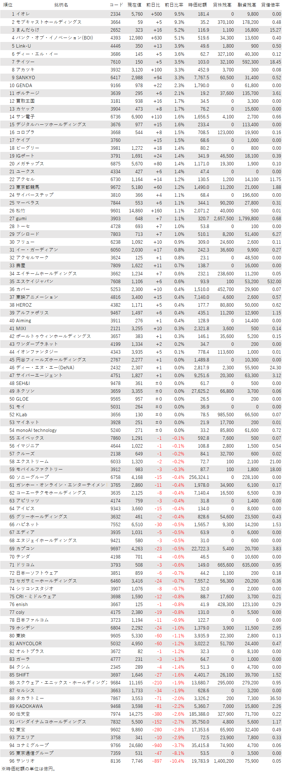 最後に騰落ランキングを見ると、イオレ<2334>やモブキャストHD<3664>、バンク・オブ・イノベーション(BOI)<4393>が値上がり率上位となり、サンリオ<8136>、東京通信G<7359>、コナミG<9766>、アエリア<3758>が値下がり率上位となった。