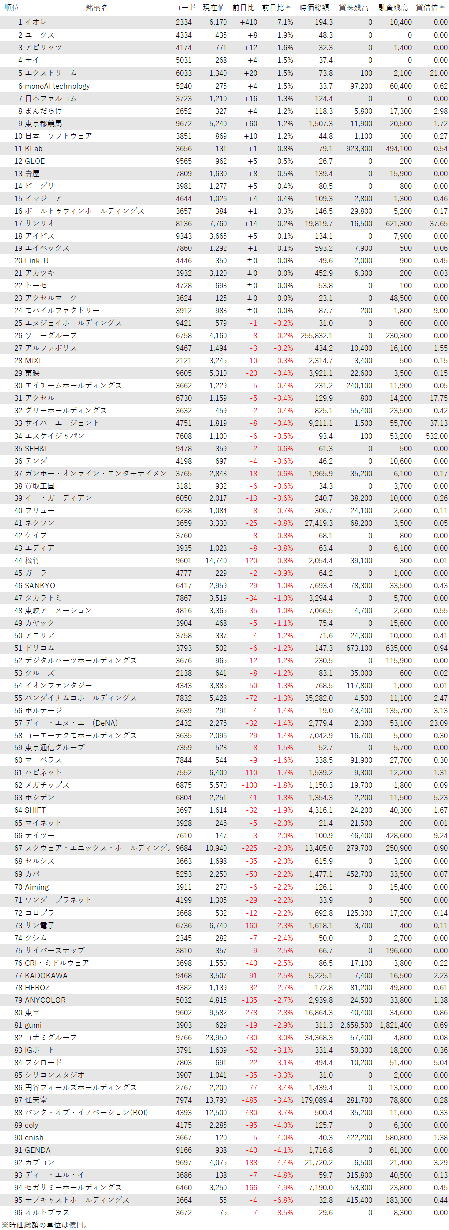 最後に騰落ランキングを見ると、イオレ<2334>やユークス<4334>、アピリッツ<4174>、モイ<5031>が値上がり率上位となり、オルトプラス<3672>、モブキャストHD<3664>、セガサミーHD<6460>、ディー・エル・イー<3686>が値下がり率上位となった。