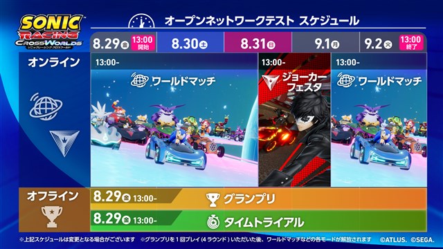 セガは、2025年9月25日に発売予定のPlayStation5、PlayStation4、Xbox Series X|S、Xbox One、Nintendo Switch、PC(Steam、Epic Games Store)用ソフト『ソニックレーシング クロスワールド』について、期間限定のオープンネットワークテストを実施することを決定した。本テストは、8月29日13時から9月2日13時までの期間、対象プラットフォーム(PlayStation5、Nintendo Switch、Xbox Series X|S、Steam、Epic Games)にて、どなたでも参加できる。さらに、8月31日13時から9月1日13時まで、ゲーム内で期間限定イベント「P5R ジョーカーフェスタ」も開催予定。本イベントでは、コラボレーサー「ジョーカー」やコラボマシン「アルセーヌウィング」でいち早くプレイすることができる。
