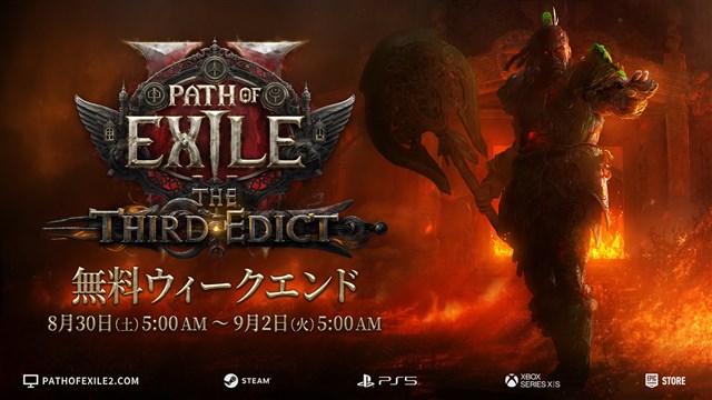 『Path of Exile 2』の「The Third Edict」は8月30日にPC、Steam、PlayStation、Xbox、Epic Games Storeで発売開始する。早期アクセスサポーターパックを購入すると、「The Third Edict」や「Justice and Trarthan Executioner Packs」を含むコンテンツへのアクセスが可能になる。