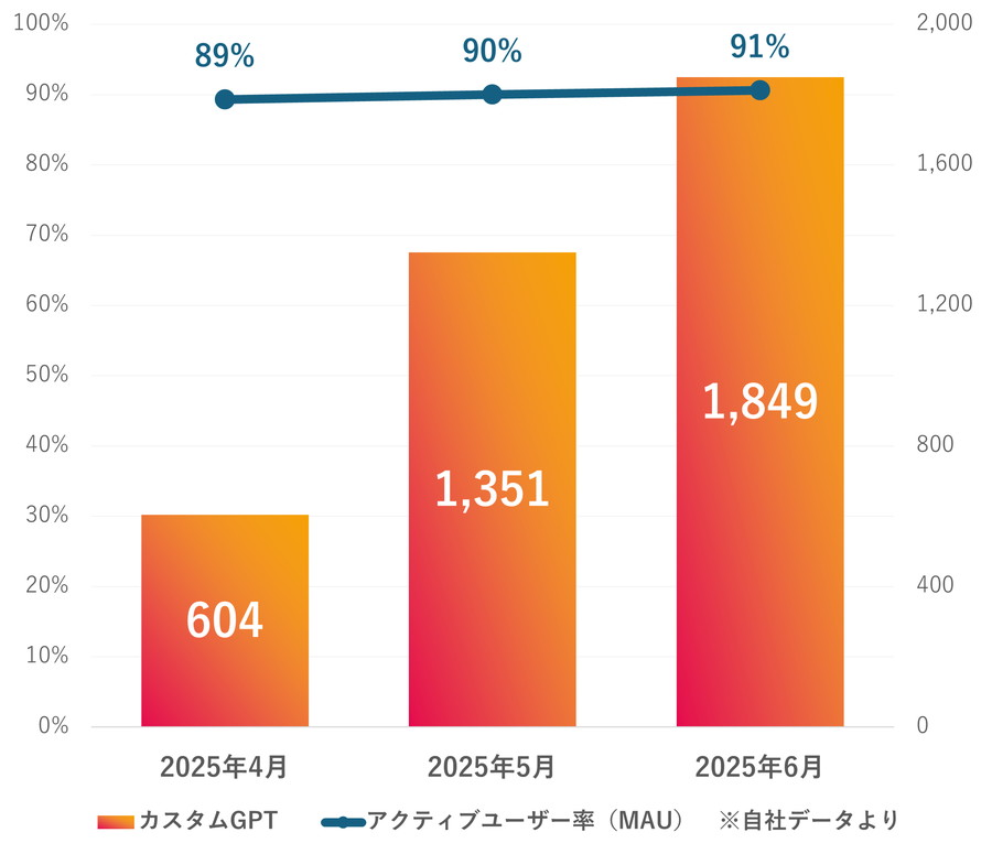 MIXI<2121>は、この日(8月21日)、2025年3月から全従業員にOpenAIの企業向け生成AIサービス「ChatGPT Enterprise」を導入し、その成果を公表した。導入から3ヶ月未満で、アクティブユーザー率(WAU)は80%に達し、1800個以上のカスタムGPTが作成されるなど、生成AIを「使いこなす」企業文化が根付いているという。