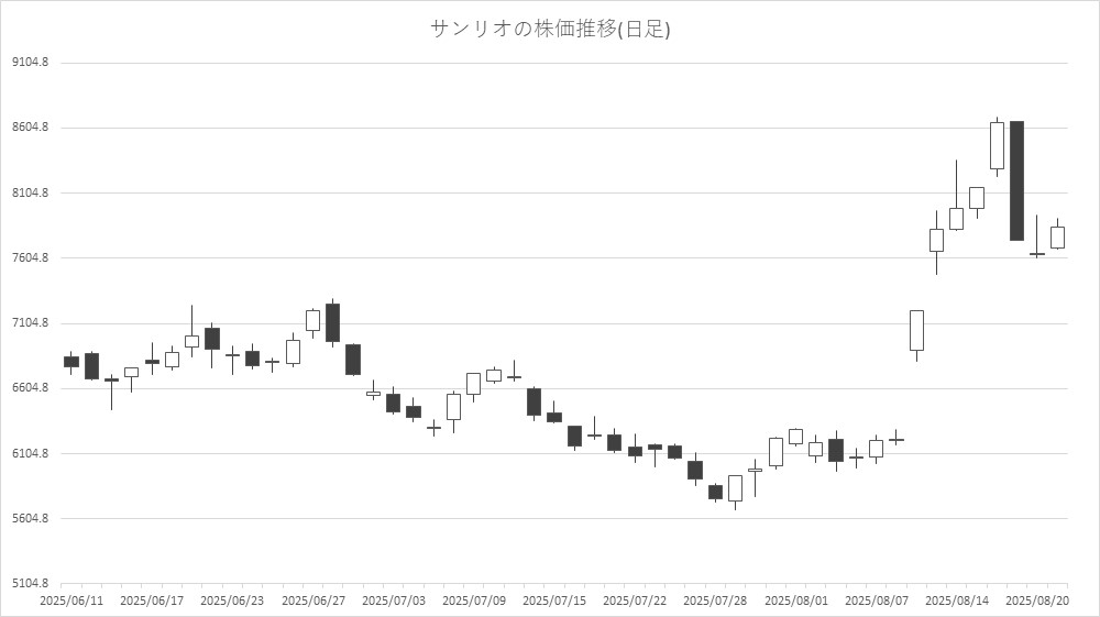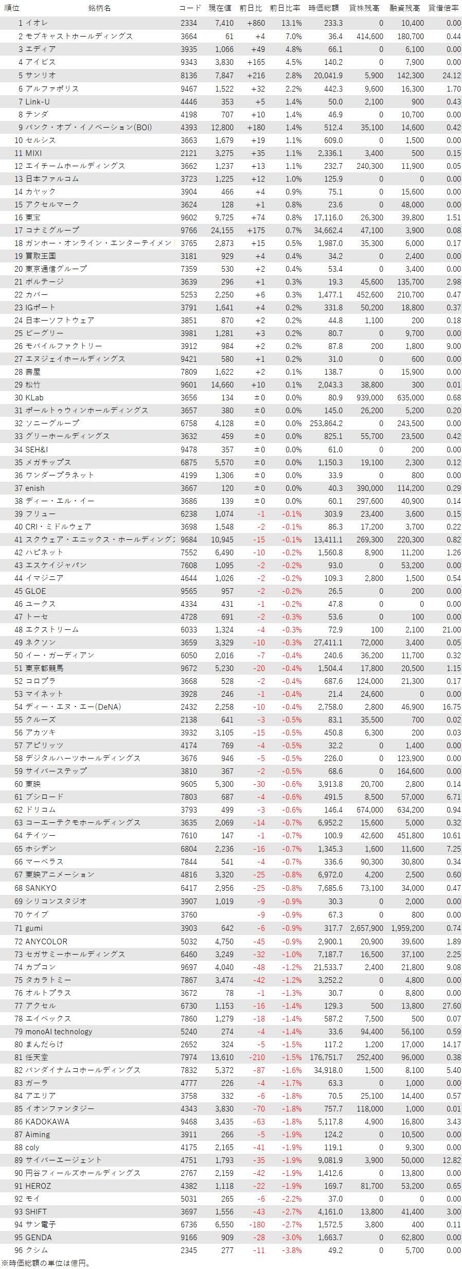 アニメやホビーなどその他コンテンツ関連銘柄は、サンリオ<8136>、東宝<9602>、IGポート<3791>、エディア<3935>が高く、タカラトミー<7867>、KADOKAWA<9468>、GENDA<9166>、東映アニメ<4816>、フリュー<6238>、ブシロード<7803>が安い。