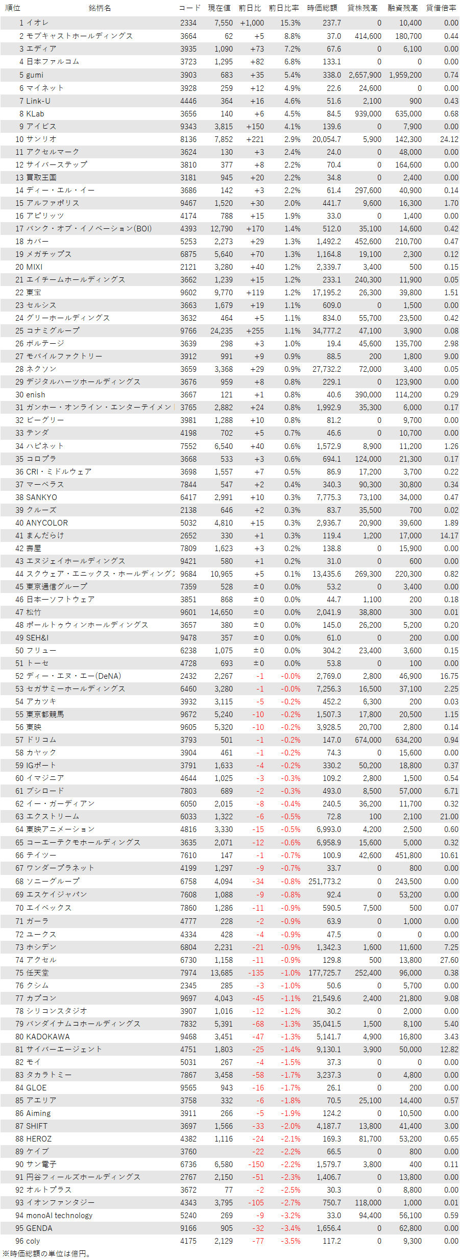 モバイルゲーム系の銘柄は、MIXI<2121>、グリーHD<3632>、ガンホー<3765>、コロプラ<3668>、モバイルファクトリー<3912>が高く、サイバーエージェント<4751>、DeNA<2432>、アカツキ<3932>、ケイブ<3760>が安い。