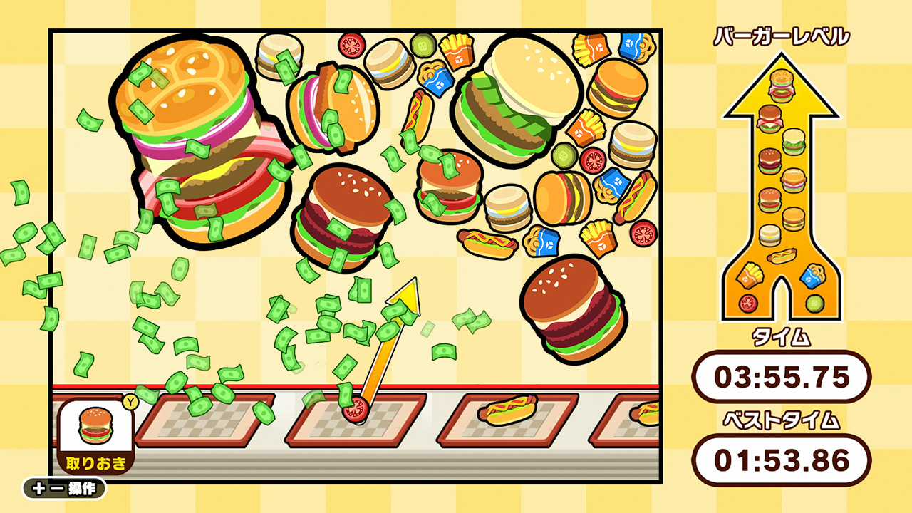 好きなバーガーを取っておける「取りおき」や、バーガーの角度を変えられる「回転」を活用して、限られたスペースを上手く使い、最高記録を目指そう!