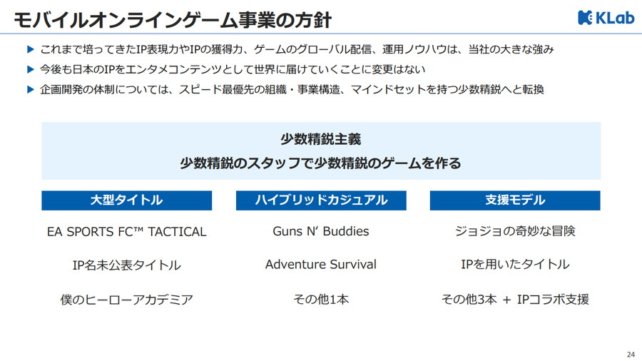 同社では、これまで培ってきたIP表現力やIPの獲得力、ゲームのグローバル配信・運用ノウハウなどを活かしつつ、少数精鋭主義、少数精鋭のスタッフで少数精鋭のゲームを開発していく考え。スピード最優先の組織・事業構造と、そうしたマインドセットを持つ少数精鋭へと転換していく。