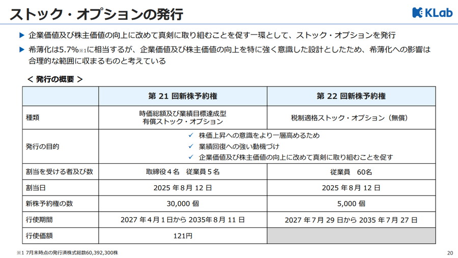 他方、企業価値および株主価値の向上に改めて真剣に取り組むことを促す一環としてストックオプションを発行した。希薄化は5.7%に相当するものの、企業価値と株主価値の向上を特に強く意識した設計としたため、希薄化への影響は「合理的な範囲」にとどまるという。