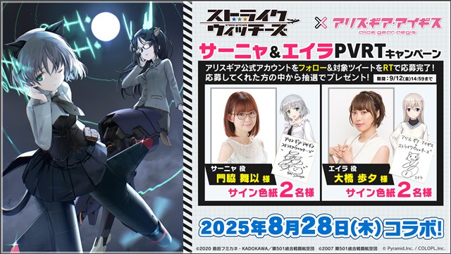 『ストライクウィッチーズ』×『アリス・ギア・アイギス』のコラボ開催を記念して、島田フミカネ氏描き下ろしのコラボキービジュアルを公開した。また、イベント開催日の8月28日15:00まで、毎日コラボ情報の公開を予定している。開催前日の8月27日20:00には特別映像をプレミア公開予定となるので、お楽しみに。