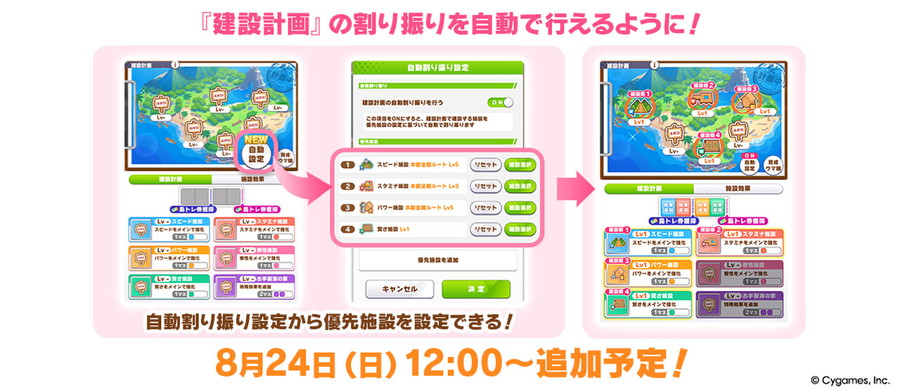 2025年8月24日12:00から、育成シナリオ「無人島へようこそ -DESIGN YOUR ISLAND-」に「建設計画の自動割り振り設定」機能を追加する。優先施設を設定して、建設計画の自動割り振りが行えるようになる。