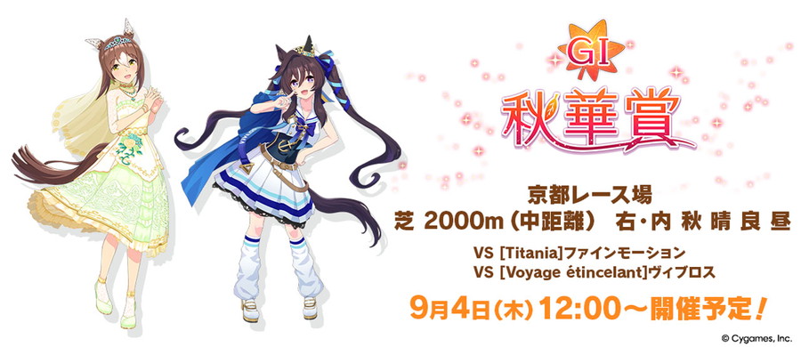 次回レジェンドレースの舞台は「秋華賞」(京都レース場 芝2000m(中距離)右・内 秋 晴 良 昼)となる。対戦相手となるLEGENDウマ娘は[Titania]ファインモーションと、[Voyage étincelant]ヴィブロス。レジェンドレース「秋華賞」は、2025年9月4日から開催する。