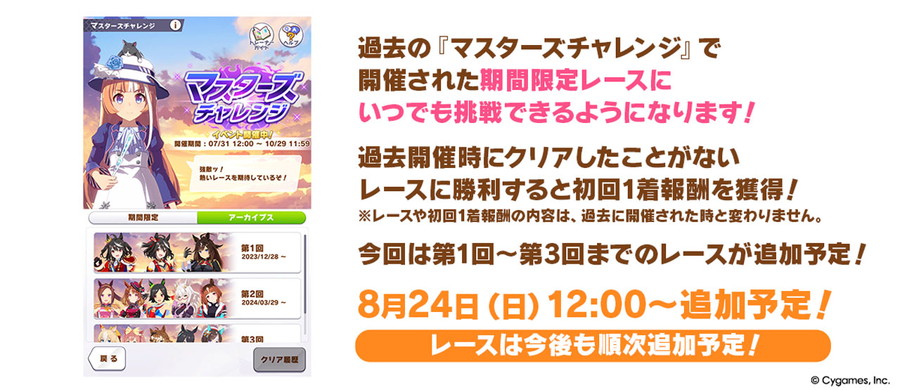 2025年8月24日12:00から、強力なウマ娘たちと対決できるイベント「マスターズチャレンジ」に「アーカイブス」を追加する。過去にマスターズチャレンジで開催した一部の期間限定レースにいつでも挑戦でき、レースに勝利することで初回1着報酬を獲得できる。