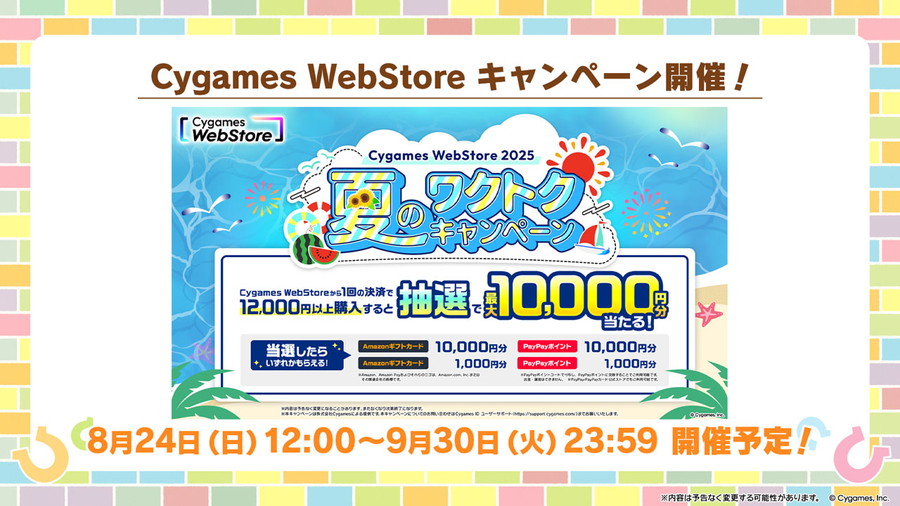 2025年8月24日12:00から、「Cygames WebStore 夏のワクトクキャンペーン2025」を開催する。キャンペーン期間中にCygames WebStore『ウマ娘 プリティーダービー』販売ページで1回の決済で1万2000円以上商品を購入すると、抽選で最大1万円分のギフトコードが当たる。