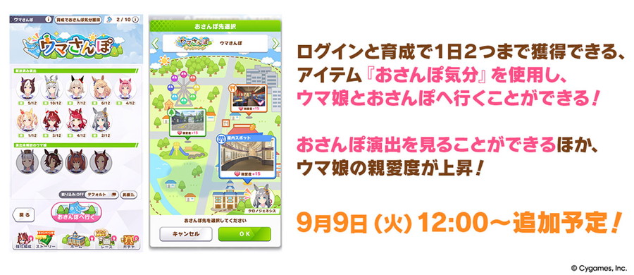 2025年9月9日12:00から、「ウマさんぽ」機能を追加する。ログインと育成完了で1つずつ、1日あたり最大2つ獲得できる「おさんぽ気分」を使用し、ウマ娘とおさんぽへ行くことができる。おさんぽへ行くと、おさんぽ演出を見ることができ、ウマ娘の親愛度が上昇する。また、「KFCさんぽ」も含む、これまでのウマさんぽキャンペーンで登場した全てのおさんぽ先が選択できる。