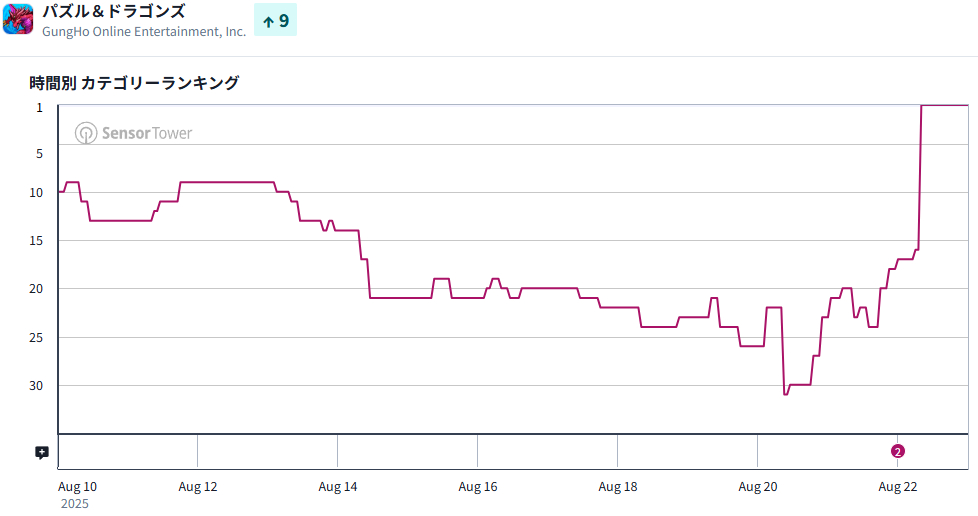 ガンホー・オンライン・エンターテイメント<3765>の『パズル&ドラゴンズ』がApp Storeセールスランキングで首位を獲得した。昨日8月22日よりアニメ『鬼滅の刃』とのコラボイベント・キャンペーンを開催しており、売上を伸ばしているようだ。