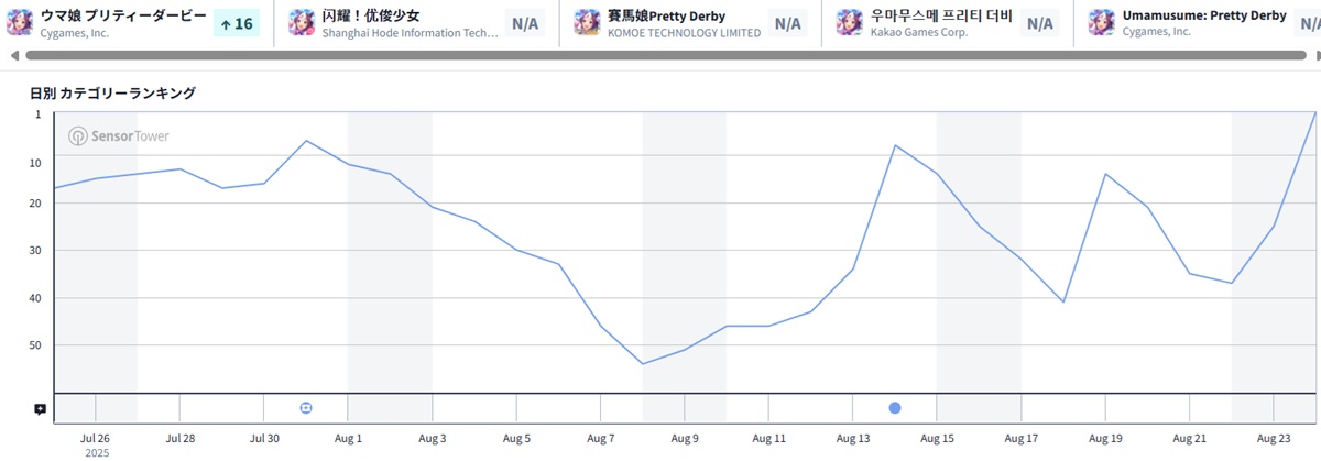 8月25日9時現在のApp Storeセールスランキング(ゲームカテゴリー)は、Cygamesの『ウマ娘 プリティーダービー』が36ランクアップで首位に躍り出た。