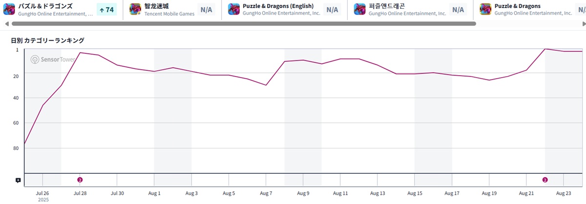 | 3 | 18 | ↑15 | パズル&ドラゴンズ | ガンホー・オンライン・エンターテイメント<3765> |