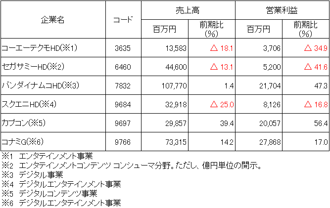 増益組を見ると、バンダイナムコHDは、モバイルなど運用型ゲームでヒット作品を送り出しただけでなく、コンソールゲームでヒットタイトルをリリースするなど好調だった。コナミGは運用型ゲームを中心に伸びた。カプコンは、自社タイトルのアニメ化や新作発表にあわせて旧作のリピート販売を伸ばした。