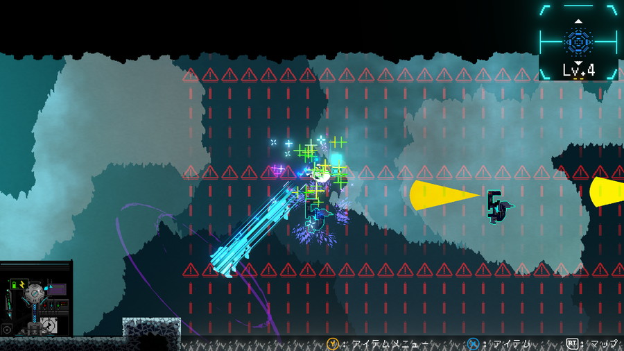 ステージには視界を持つロボットたち――「アニマトロン」が存在する。アニマトロンは人間を襲う習性があるため、見つかってはいけない。8方向ダッシュを駆使してアニマトロンの視界を搔い潜り、地下世界を探索したい。ステージ上には強化アイテムの「フィルター」が散らばっている。アイテムによってダッシュを強化し、さらなるステージを探索してゴールを目指そう。