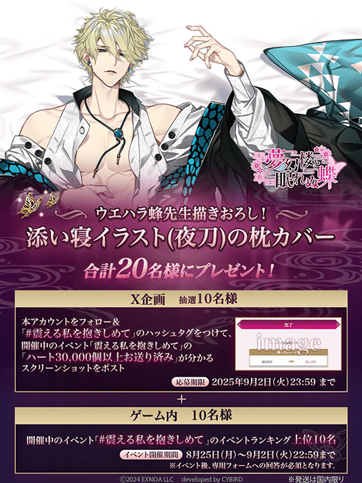 公式Xにて、ハッシュタグ「#震える私を抱きしめて」をつけて、ゲーム内イベントで「ハートを30,000個以上贈っている」ことが分かるスクリーンショットポストをした人の中から、抽選で10名に「添い寝イラスト(夜刀)の枕カバー」をプレゼント。
