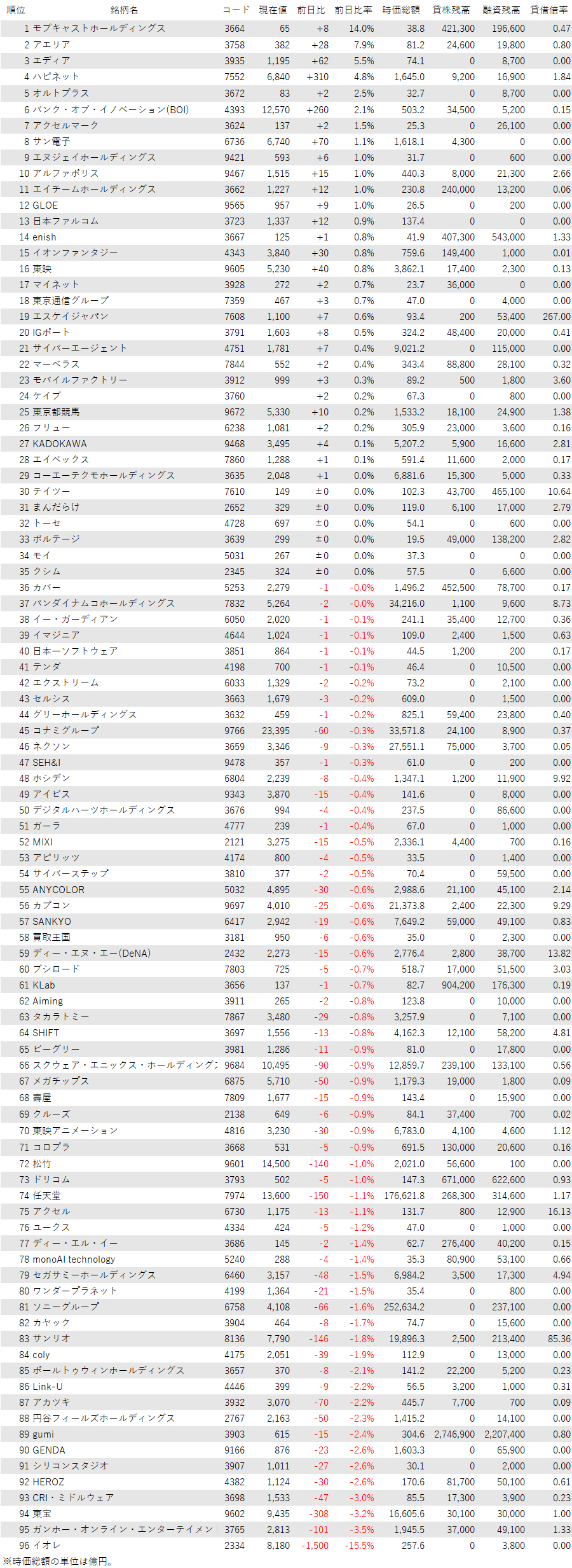 最後に騰落ランキングを見ると、モブキャストHD<3664>やアエリア<3758>、エディア<3935>、ハピネット<7552>が値上がり率上位となり、イオレ<2334>、ガンホー<3765>、東宝<9602>、CRI・ミドルウェア<3698>が値下がり率上位となった。