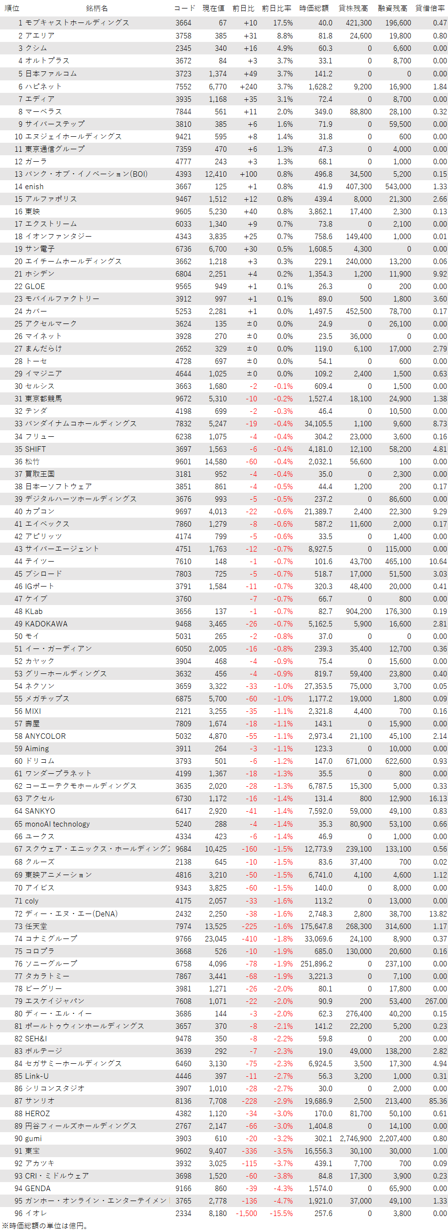 モバイルゲーム系の銘柄は、モバイルファクトリー<3912>が高く、サイバーエージェント<4751>、MIXI<2121>、DeNA<2432>、グリーHD<3632>、ガンホー<3765>、アカツキ<3932>、コロプラ<3668>、ケイブ<3760>が安い。