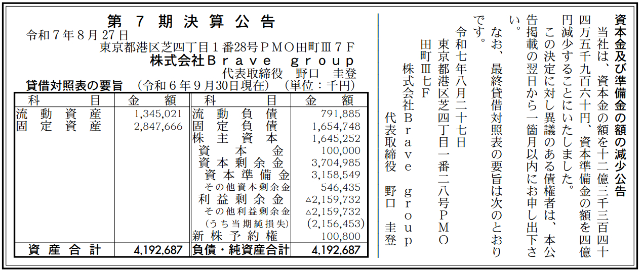 Brave Groupが減資を行う。本日8月27日付の「官報」に掲載された「資本金及び準備金の額の減少公告」によると、資本金を12億3300万円、資本準備金を4億円減らすとのこと。昨年もちょうどこの時期に減資を行っていた(関連記事)。