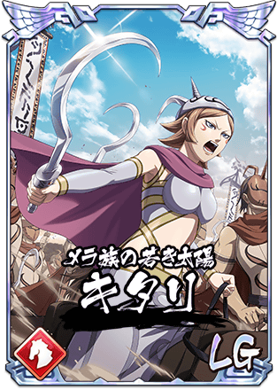 山界の死王・楊端和に従い、秦国による鄴攻略戦に参戦した『メラ族』族長カタリの妹・キタリは、武将固有特性『メラ族の太陽』の上昇量に応じて、自部隊を強化。