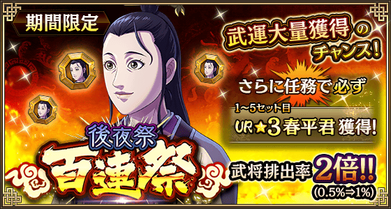 SR★4武将排出確率が通常時と比べて6倍にUPします!